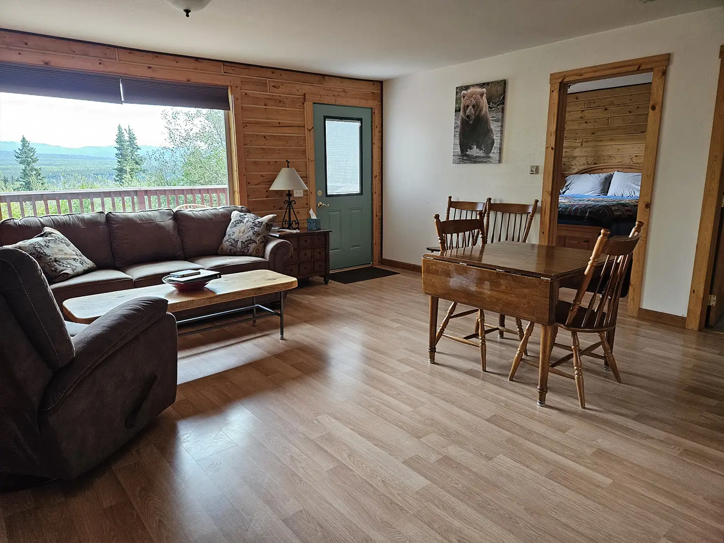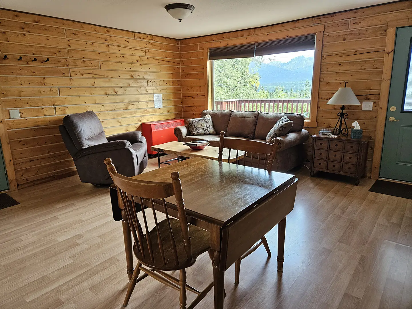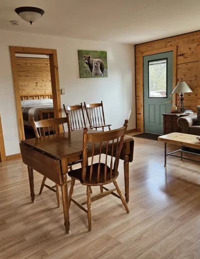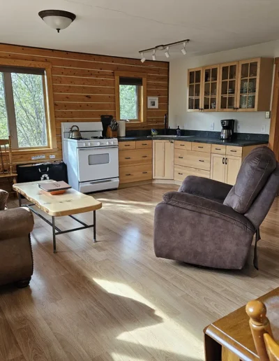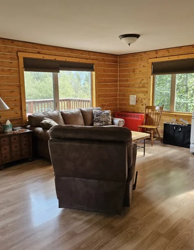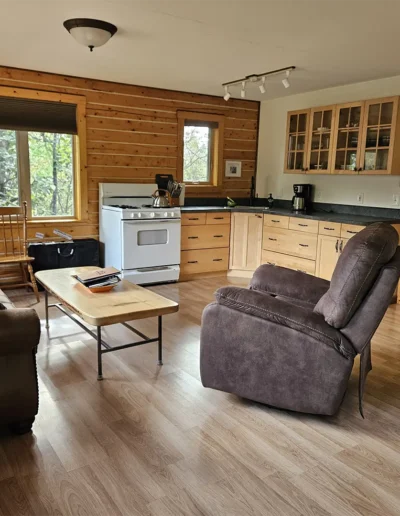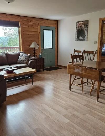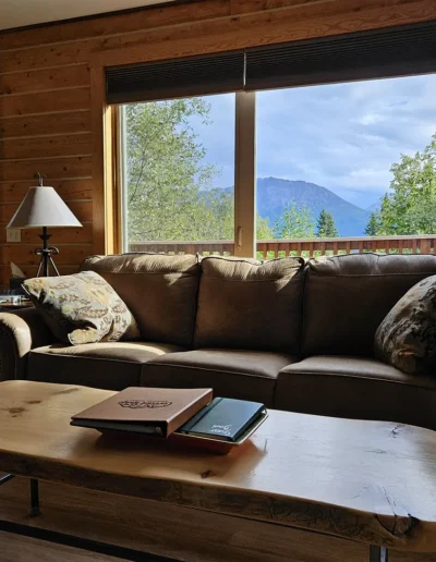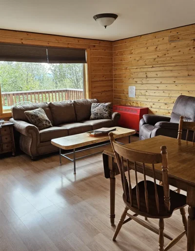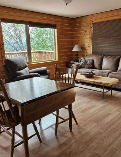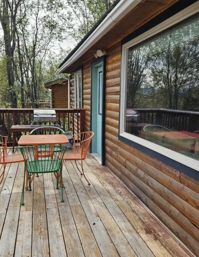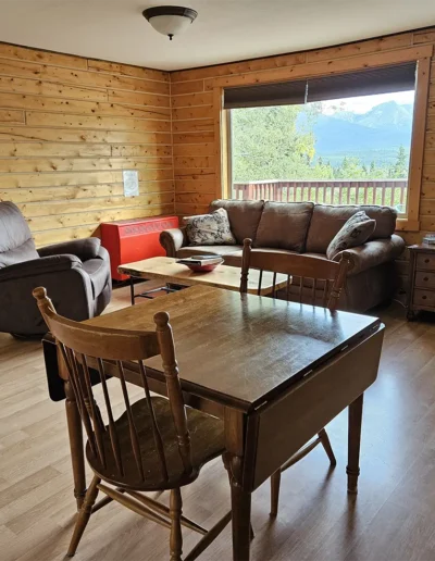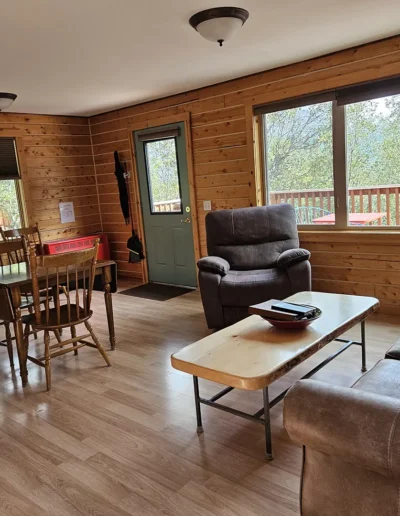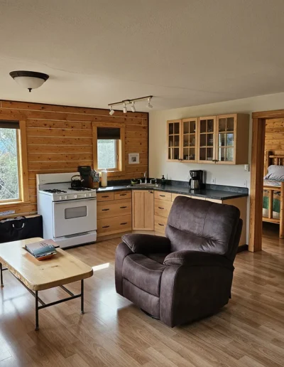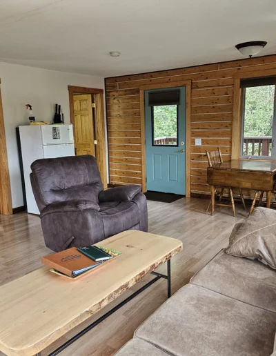 The Kennicott is the sixth and final cabin in our collection, named for the glacial Kennicott River, which carries silty meltwater from the Kennicott and Root Glacier through the heart of Wrangell–St. Elias National Park. The river’s distinctive milky color comes from finely ground rock—known as glacial flour—created as the glacier slowly grinds its way through the valley. Thoughtfully designed at 525 square feet, the private deck offers excellent views of our property and the Chugach Mountains. Inside, you’ll find a welcoming living room area with a sleeper sofa, a comfortable queen bedroom, a full kitchen, and a private bathroom—everything you need for a quiet, well-appointed stay surrounded by Alaska’s vast wilderness.