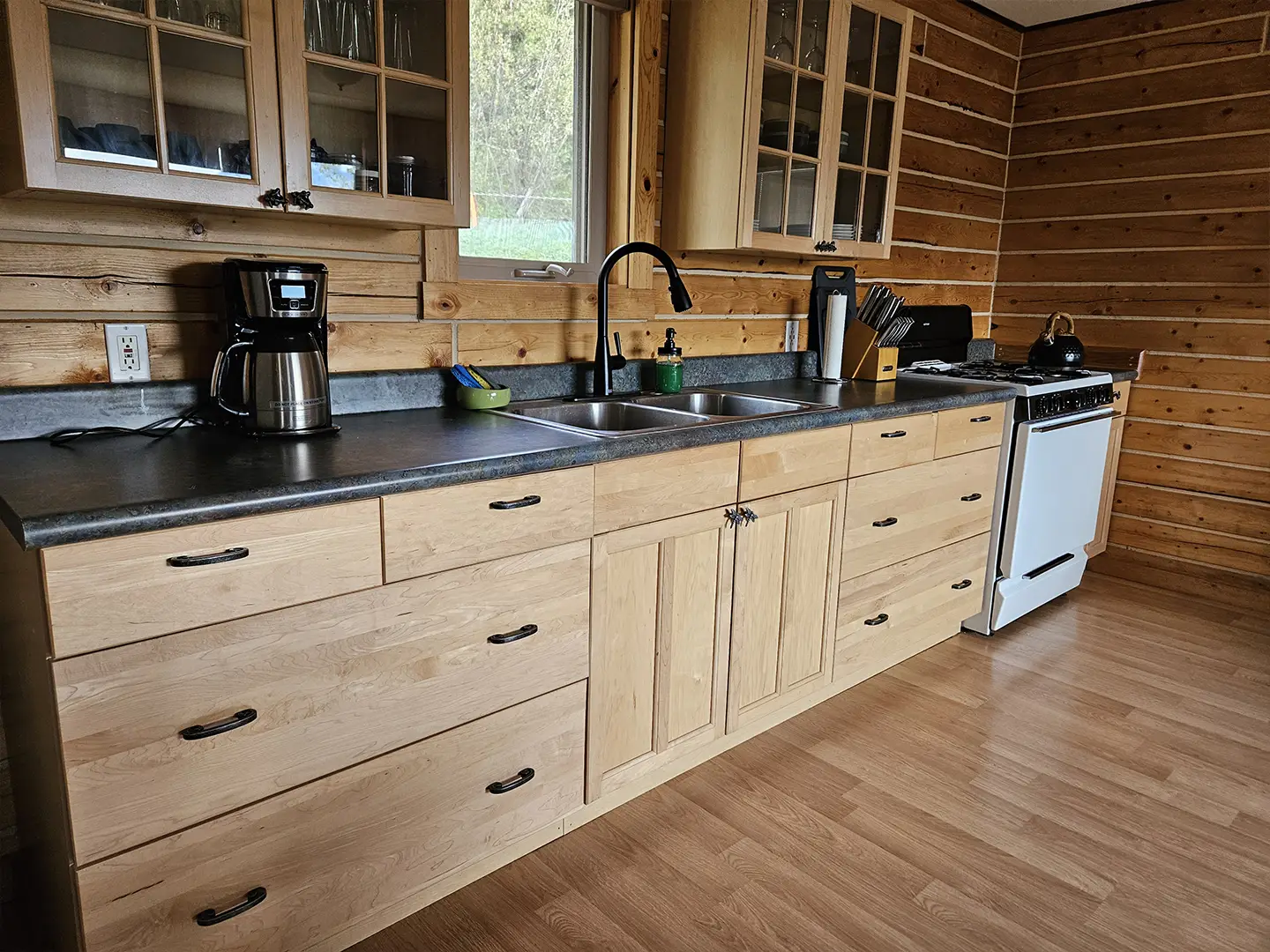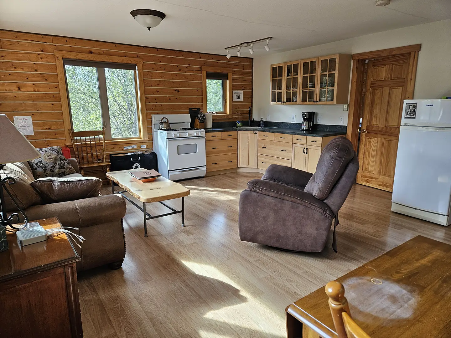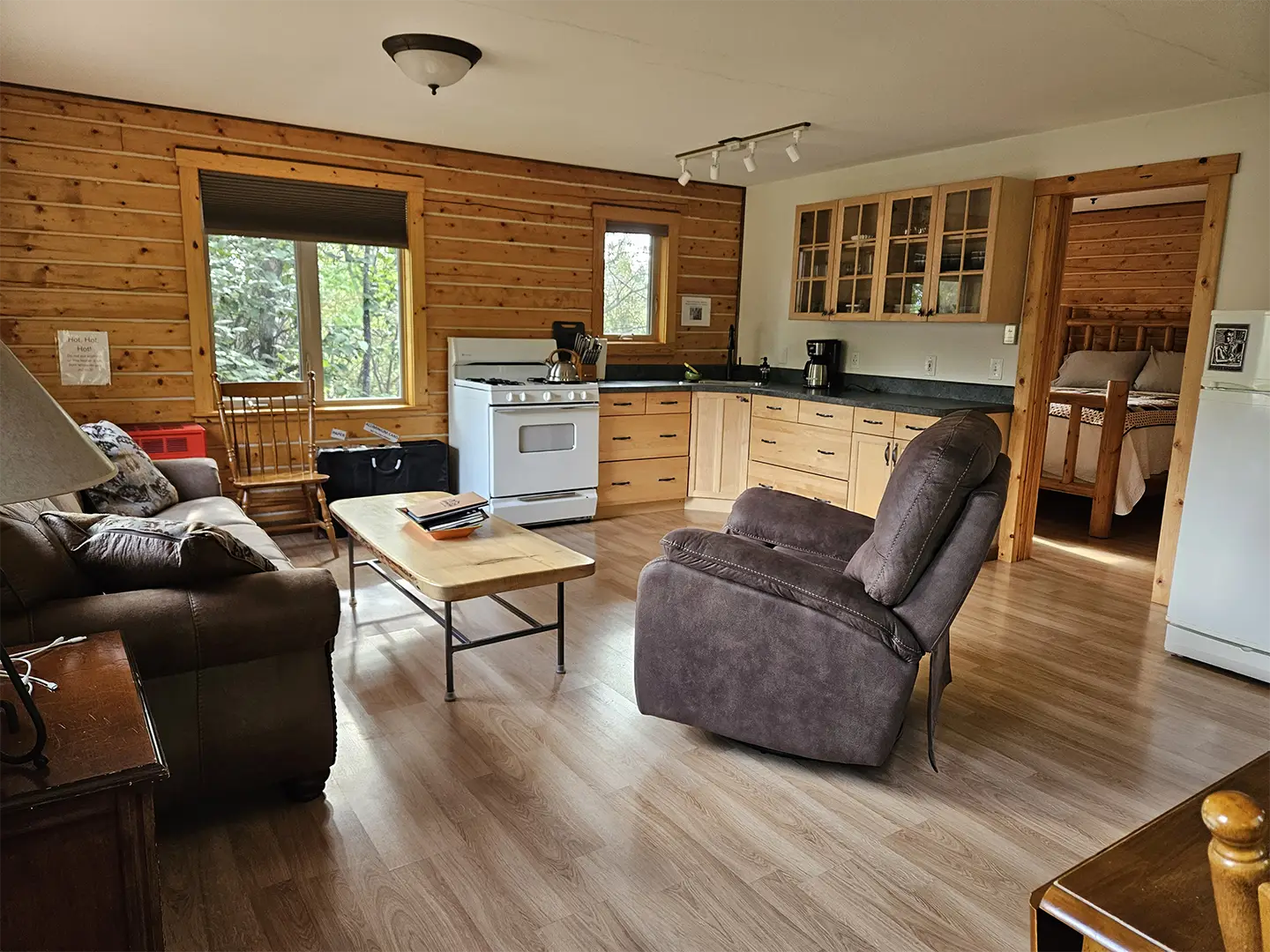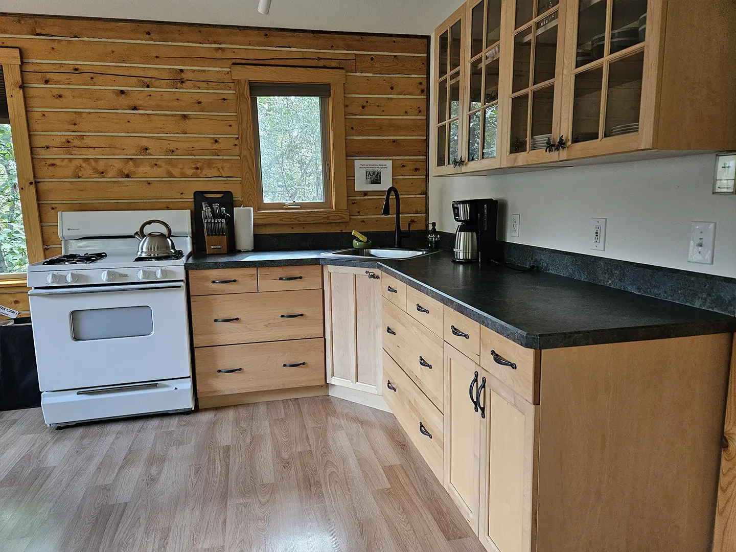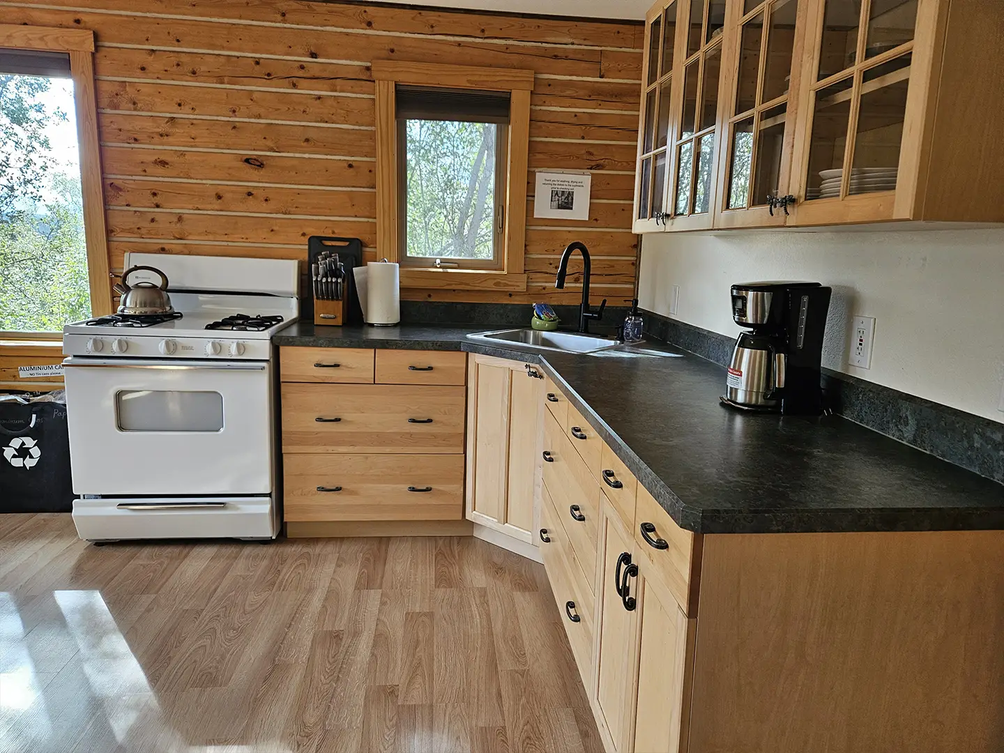 All cabins are equipped with a fridge, range/oven, kitchen utensils, a grill on the deck, and umbrellas. We also offer free WiFi in each guest house. The cabins have power 24/7 and can run a CPAP machine if needed. We can provide a queen sized blow-up mattress or cot if needed. There is no toaster or hair dryer provided to avoid unnecessary pull on our off-grid electrical system.